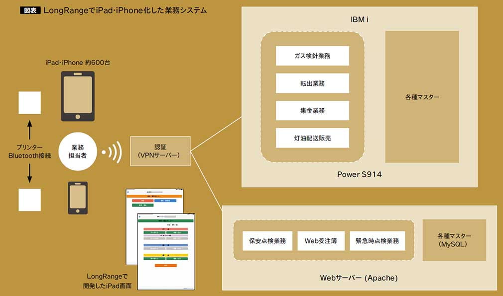 1971年のシステム/3の導入以来、IBMミッドレンジ機のユーザーである同社では、2016年に顧客のガス機器・設備の保安点検作業のフローを用紙への手書きからiPadへの入力に切り換え、システムの自動更新を実現した(従来は帰社後、CUI画面で手入力しシステム更新)。