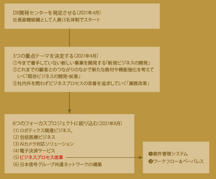 さらに2021年8月、発足してから約4カ月を費やして提案された約20に及ぶ開発テーマのなかから、6つのフォーカスプロジェクトに絞り込んだ。すなわち、(1)ロボティクス関連ビジネス、(2)包括医療ビジネス、(3)AIカメラ対応ソリューション、(4)電子決済サービス、(5)ビジネスプロセス改革、(6)日本信号グループ共通ネットワークの構築、である。