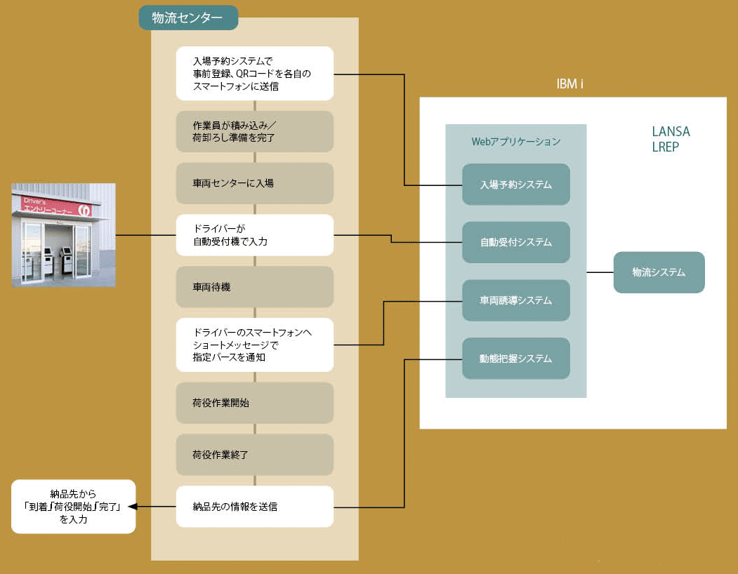 この物流センターでも、LANSAで開発した新システムが稼働している。竣工と同時に本稼働した配送車(トラック)の自動受付、入場予約、車両誘導、動態把握の各システムである。