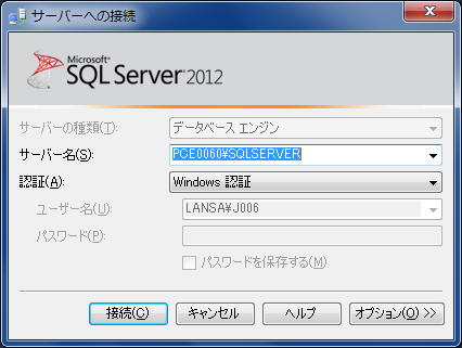 (3) SQL Server Management Studioが起動すると、「サーバーへの接続」ダイアログが表示されます。