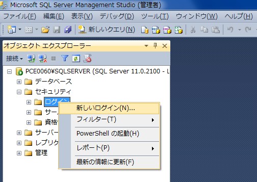 (4) オブジェクトエクスプローラーから、「サーバー名」->「セキュリティ」->「ログオン」を開いて下さい。
