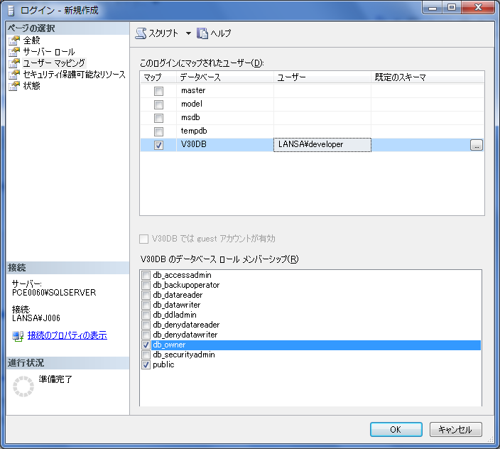 データベースを選択している状態で、画面下部のリストから「db_owner」と「public」を選択して下さい。