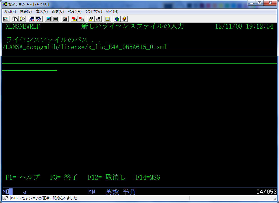 (3) F6= 追加を押下し、[新しいライセンスファイルの入力]画面が表示されますので、ライセンス・コードのXMLファイルへのパスを入力して、Enterキーを押してください。