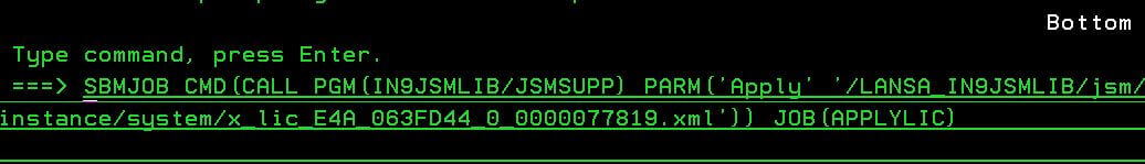 SBMJOB CMD(CALL PGM(DCXJSMLIB/JSMSUPP) PARM('Apply' '/LANSA_dcxjsmlib/jsm/instance/system/ライセンスファイル.xml')) JOB(APPLYLIC)