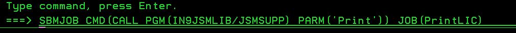 SBMJOB CMD(CALL PGM(DCXJSMLIB/JSMSUPP) PARM('Print')) JOB(PRINTLIC)