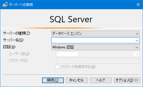 (3) SQL Server Management Studioが起動すると、「サーバーへの接続」ダイアログが表示されます。インストール時に作成したサーバー名を選択し、認証は「Windows 認証」を選択し、接続ボタンをクリックしてください。