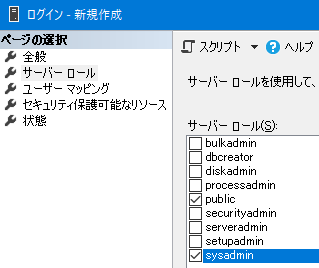 (6) 「サーバーロール」の「public」と「sysadmin」にチェックを付けてください。