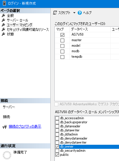 (7) 「ユーザー マッピング」の使用するデータベースの「マップ」にチェックを付け、データベースを選択している状態で、画面下部のリストから「db_owner」と「public」にチェックを付け、OKボタンをクリックしてください。
